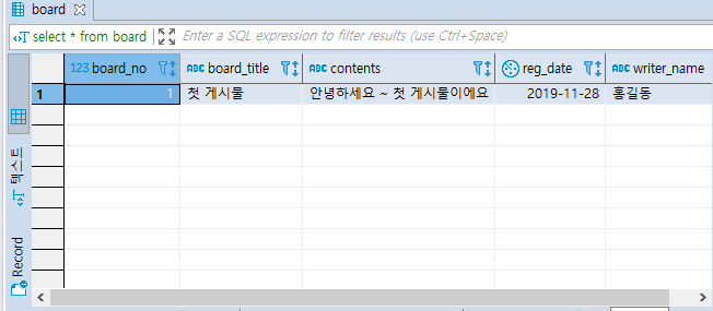 3.2 board 테이블이 정상적으로 생성되었으면 아래와 같이 임시로 데이터를 insert 한 후 select 해서 결과를 확인한다.