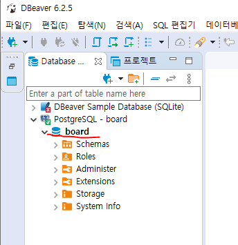 2.2 그런후에 설치된 DBeaver 를 실행 시켜 아래와 같이 board 데이터베이스와 연결한다.