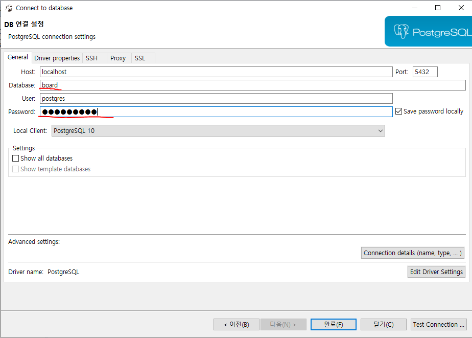 ![]() - DB 연결을 할 때, 위에 1.1번 글에서 입력했던 패스워드를 입력한다. - 그런 후에 우측 하단에있는 Test Connection 버튼을 눌러서 문제 없이 동작하는지 확인한다. |