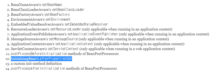 위에서 정리한 Bean 주입 직후에 동작하도록 하는 라이프 사이클 콜백함수는 아래링크에 들어가서 확인해보면 표시된 순서에 해당된다.