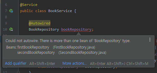 IntelliJ가 이미 BookRepository 타입의 Bean이 두 개 이상인 것을 알고 의존성 주입을 할 수 없다고 알려준다. 그리고 바로 아래에 오류를 발생시킨 클래스를 알려준다.