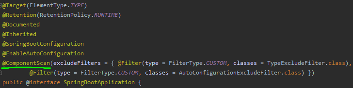 @SpringBootApplication의 내부를 보면 @ComponentScan을 확장한 것을 알 수 있다.