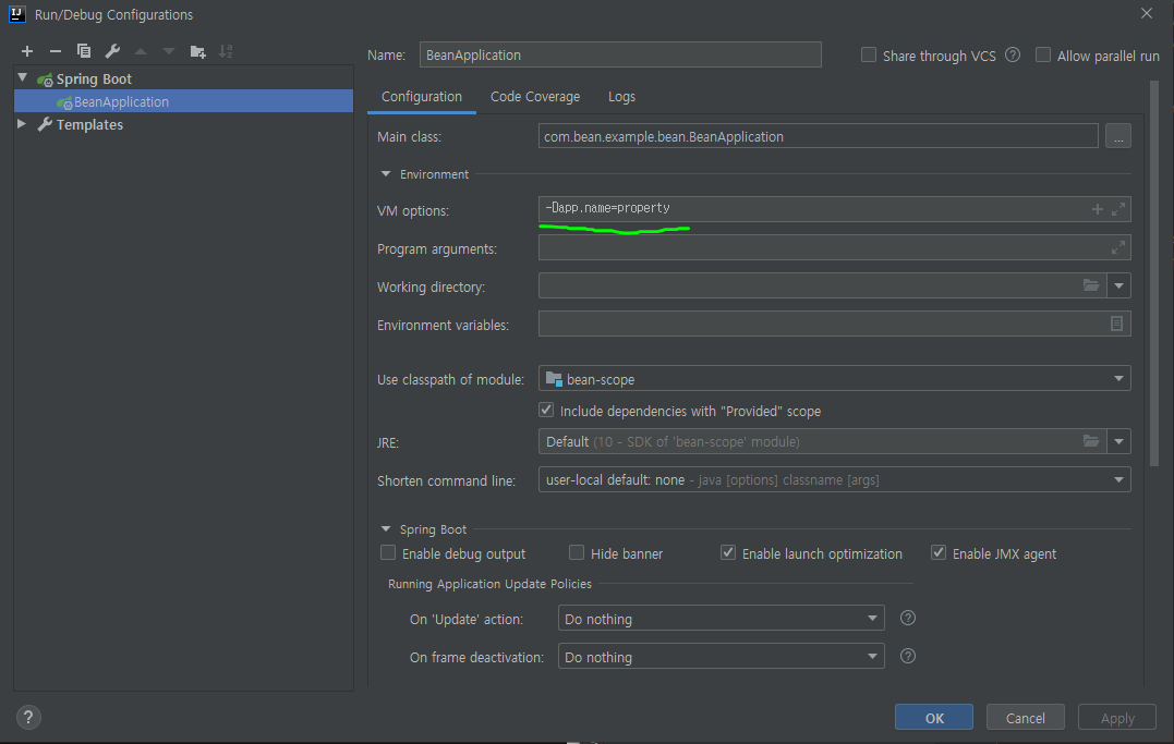 위처럼 VM options란에 "-Dapp.name=property"라고 입력한 후에 아래의 Runner 클래스를 실행 시켜보도록 하자.