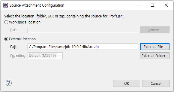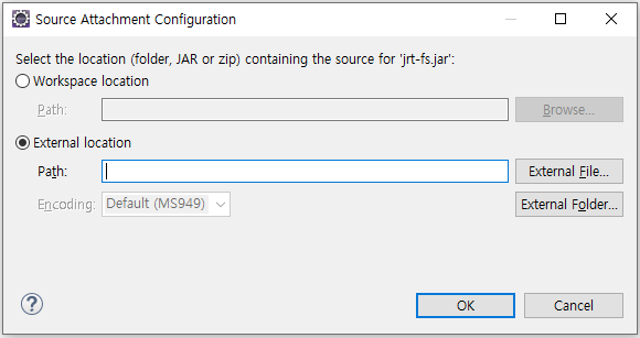 위처럼 경로를 설정해주는 팝업이 나올 것이다. "External location" 을 선택하고 "External File..."을 클릭하자.