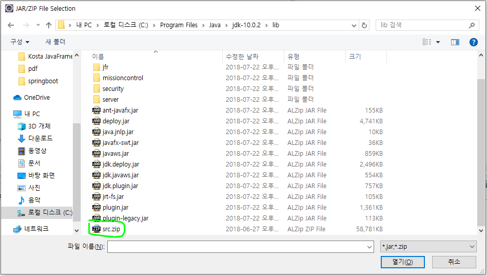 위와 같은 화면이 나오면 src.zip 파일을 선택하고 "열기" 버튼을 클릭하도록하자.