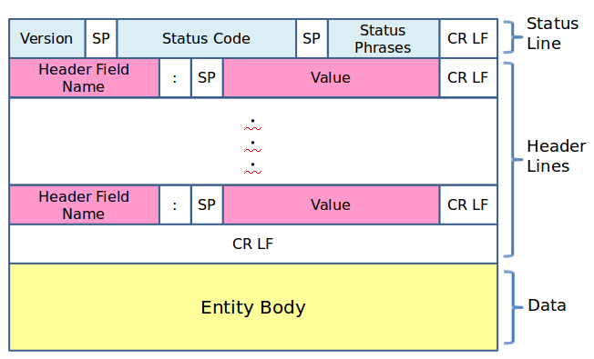 HTTP 응답 프로토콜 역시 크게 3가지로 구분되며, 각 영역의 구분은 <CR><LF> 즉, [개행] 으로 구분된다.