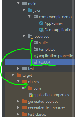 위의 파일 경로를 보면 resources 폴더 밑에 있는 파일들은 프로젝트가 빌드가되면서 tartget/classes 디렉토리 하위에 생성이된다. 그곳이 바로 위의 코드에서 명시한 "classpath:"의 위치의 시작점이다. 그렇다면 역시 직접 생성한 text.txt 파일도 해당 위치에 생성이 될 것이다.