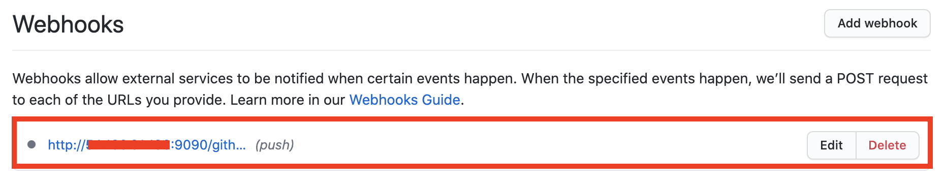 추가 버튼을 누르게 되면 아래와 같이 추가된 Webhook을 확인할 수 있다.