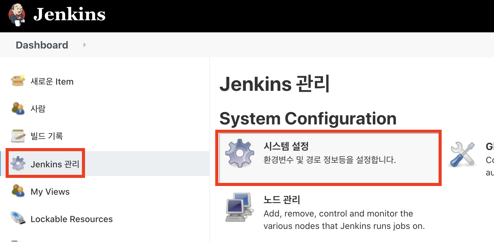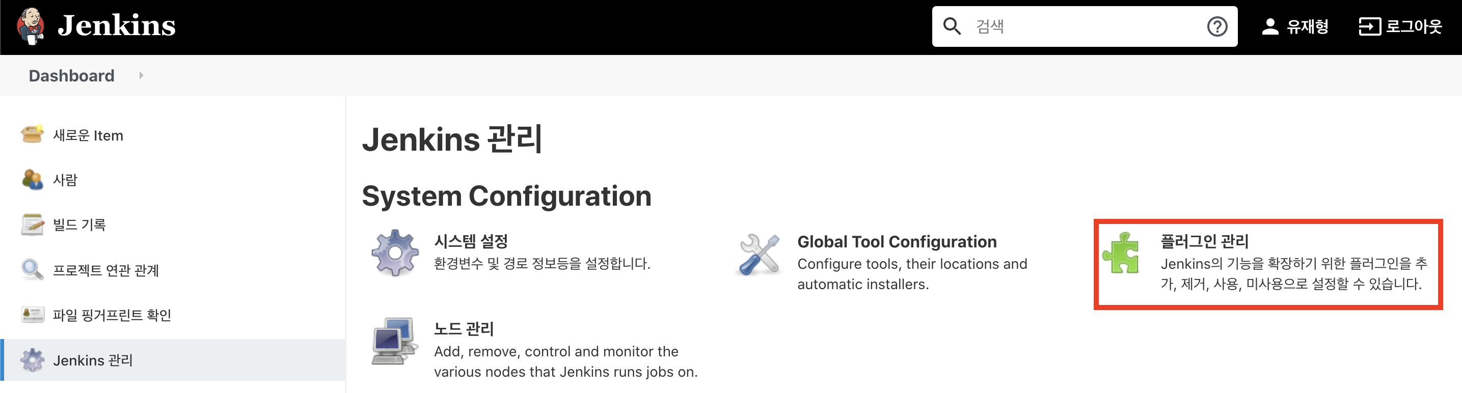 우선, Webhook 설정을 위해 jenkins 메인 대시보드에서 아래의 경로로 이동하도록하자 (Jenkins 관리 > 시스템 설정)