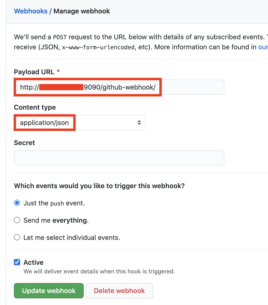 해당 페이지로 이동하면 Payload URL을 입력해야 하는데, 위에서 확인했던 Jenkins URL/github-webhook/을 입력해주도록 하자.