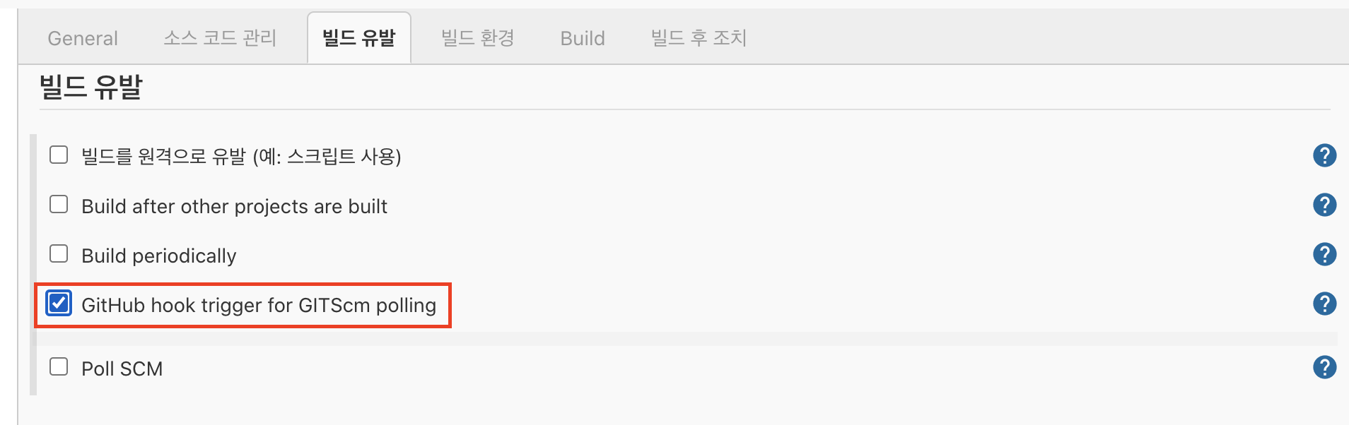 (빌드 유발 > GitHub hook trigger for GITScm polling)