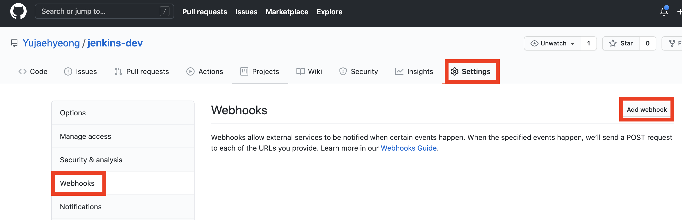 확인 후에 Webhook을 설정할 깃허브 레포지토리에서 아래와 같은 경로로 이동하도록하자.