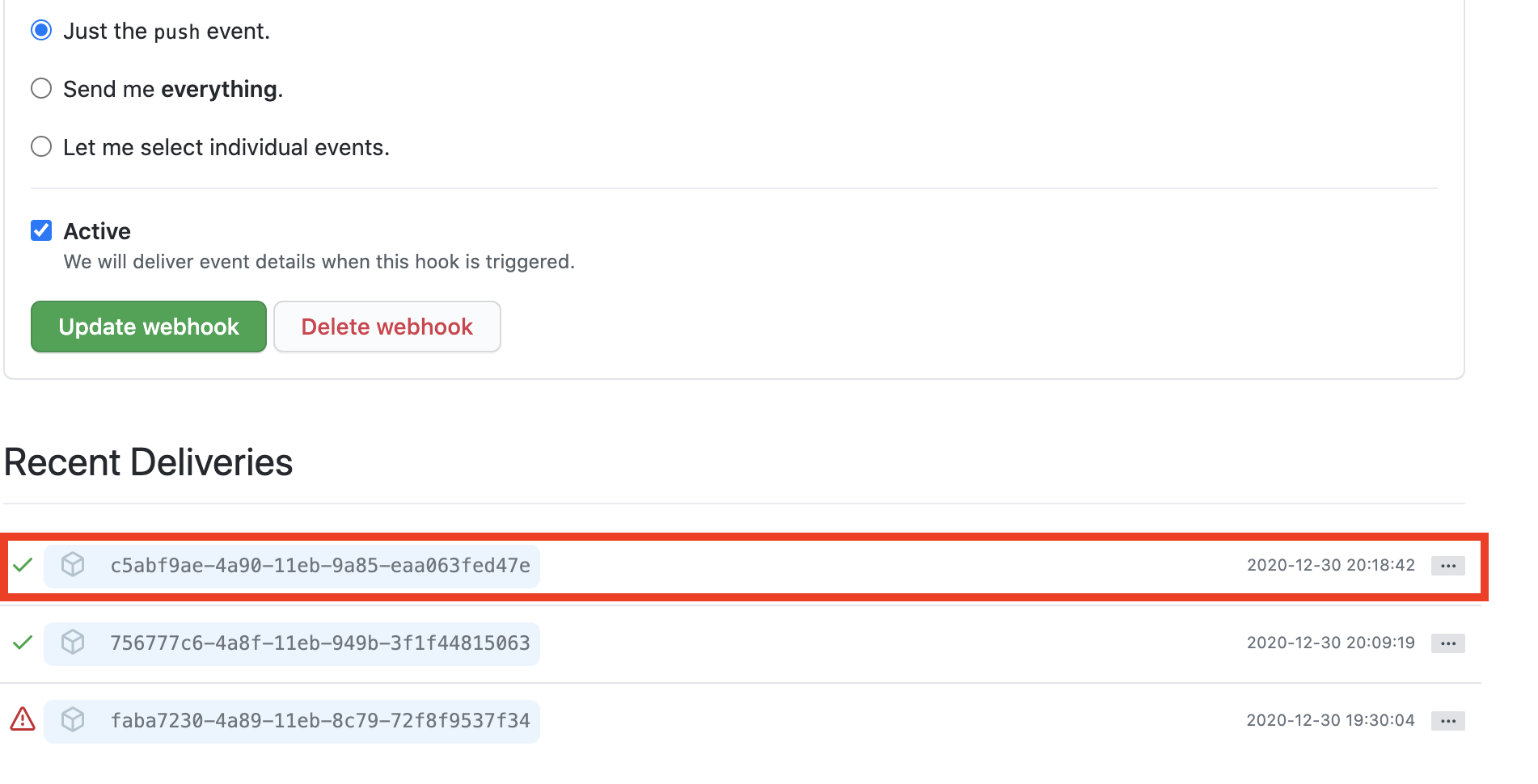 webhook을 시도한 이력을 확인하려면 github에서 webhook을 등록했던 페이지 에서 확인이 가능하다.