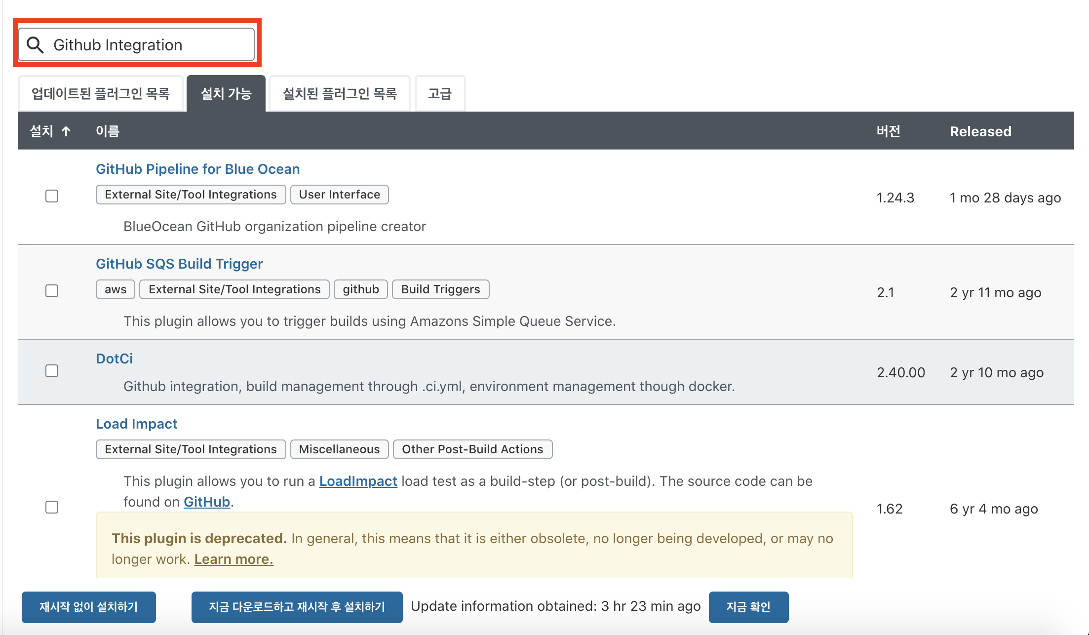 그런 후에 설치가능 탭에서 Github Integration을 검색하고 설치하도록하자(필자는 이미 설치되었기 때문에 노출안됨)