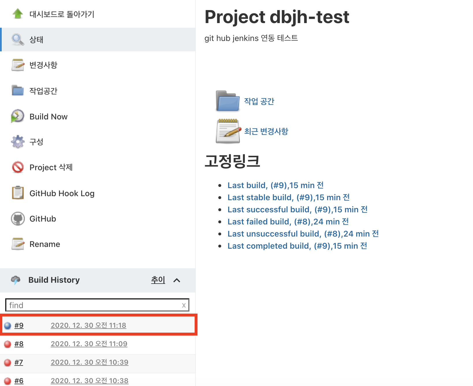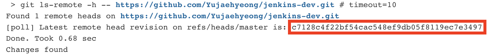 여기 까지 설정이 끝났다면, jenkins와 연동한 github repository로 push해보도록하자. 그러면 jenkins에서 빌드이력이 생성된 것을 확인할 수 있다. (push된 commit의 hash값과 젠킨스 로그에 남은 hash 값을 비교하면됨)