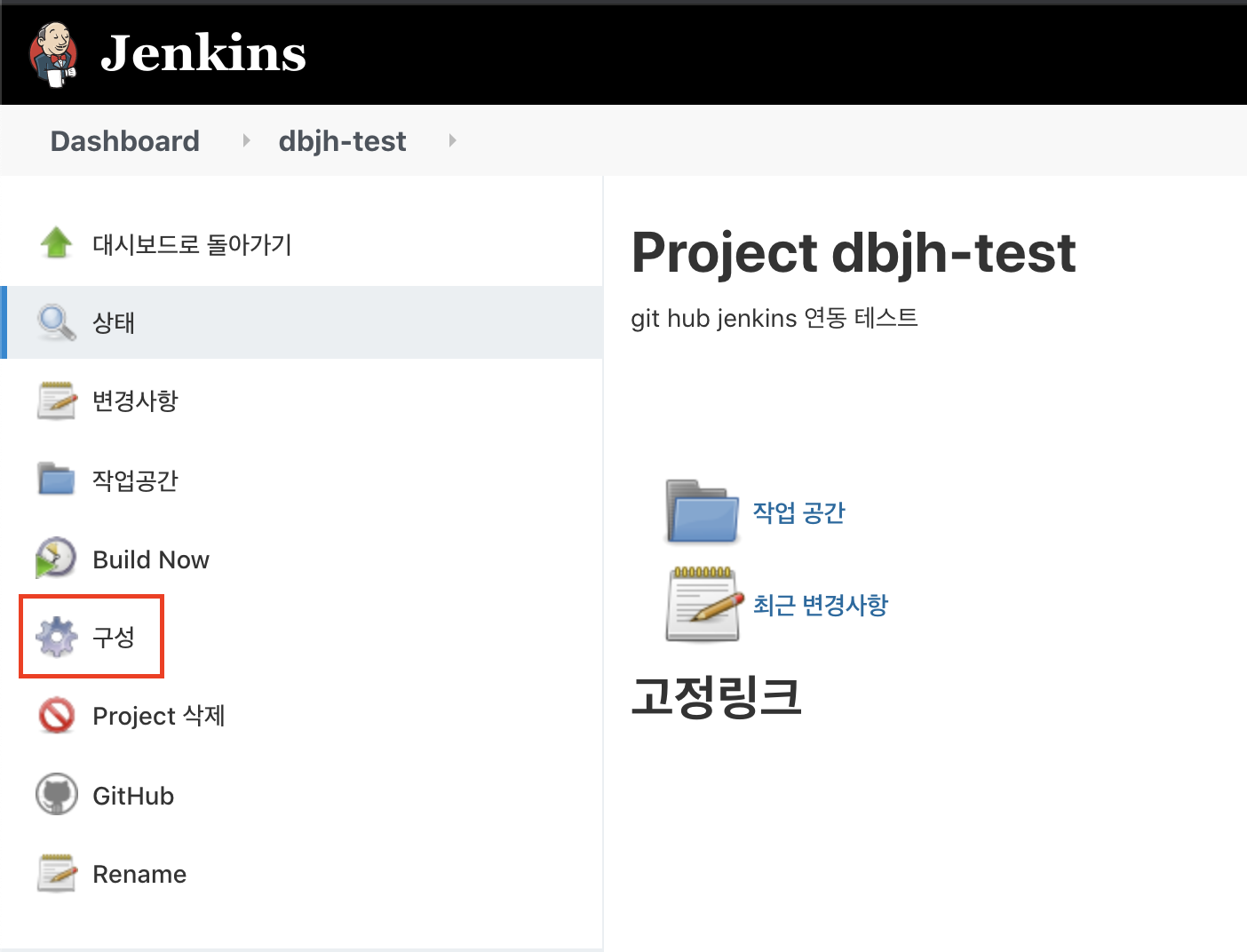 설치가 완료되었다면, 젠킨스에서 생성해둔 프로젝트 페이지로 이동하고 "구성" 메뉴로 이동하도록 하자.