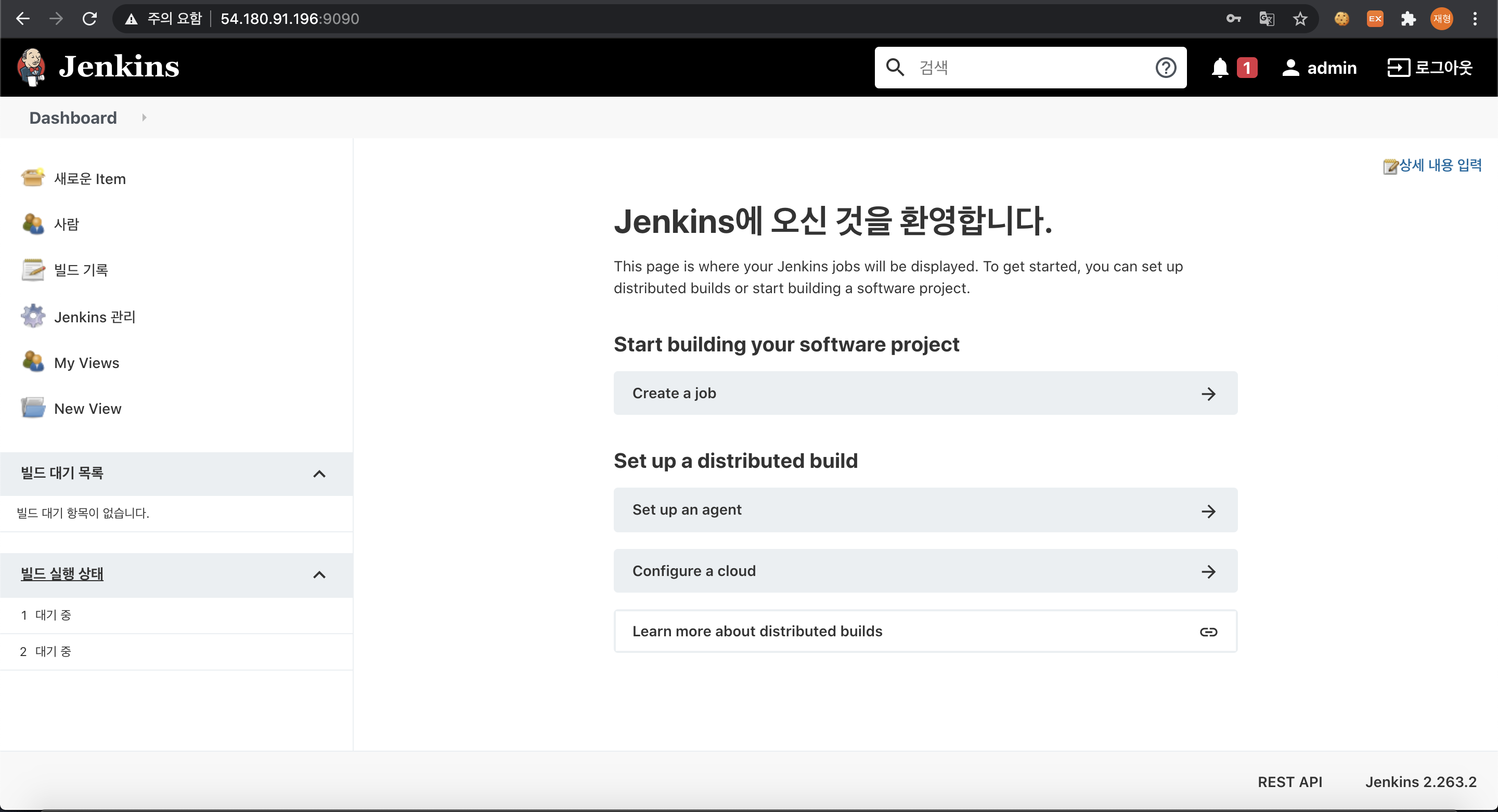 젠킨스 대시보드가 정상적으로 노출된것을 확인할 수 있다.