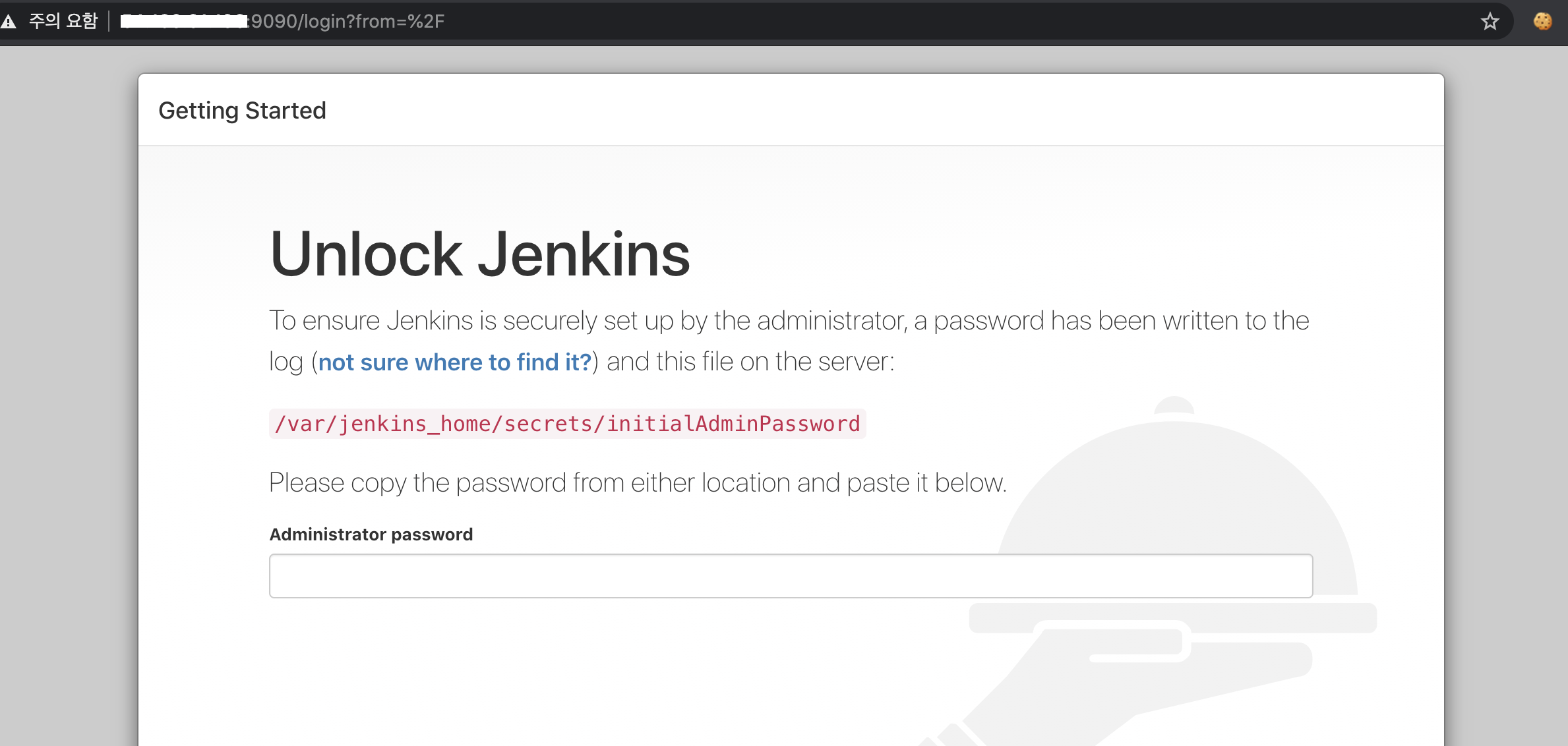 여기까지 완료되었다면 Jenkins페이지로 접속해보도록하자. 위에서 로컬포트를 9090으로 실행하였기 때문에 [host ip:port]로 접속하면된다.