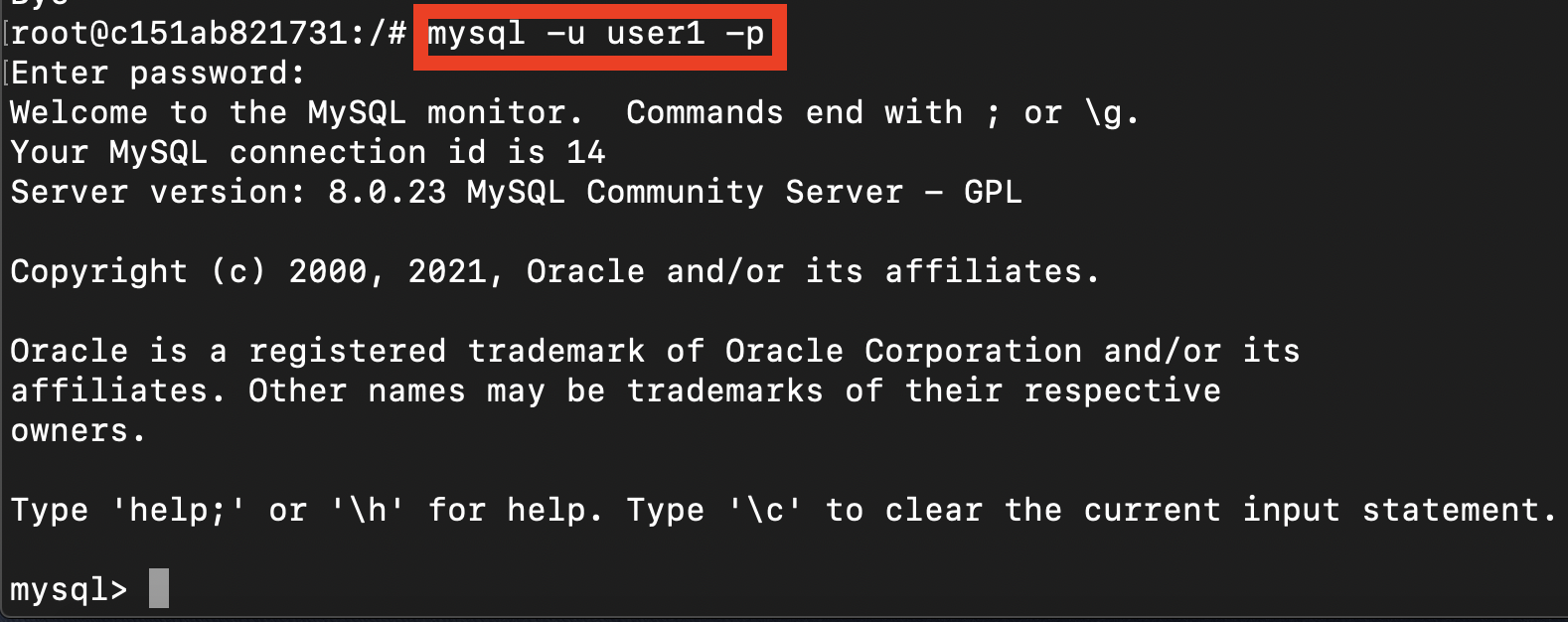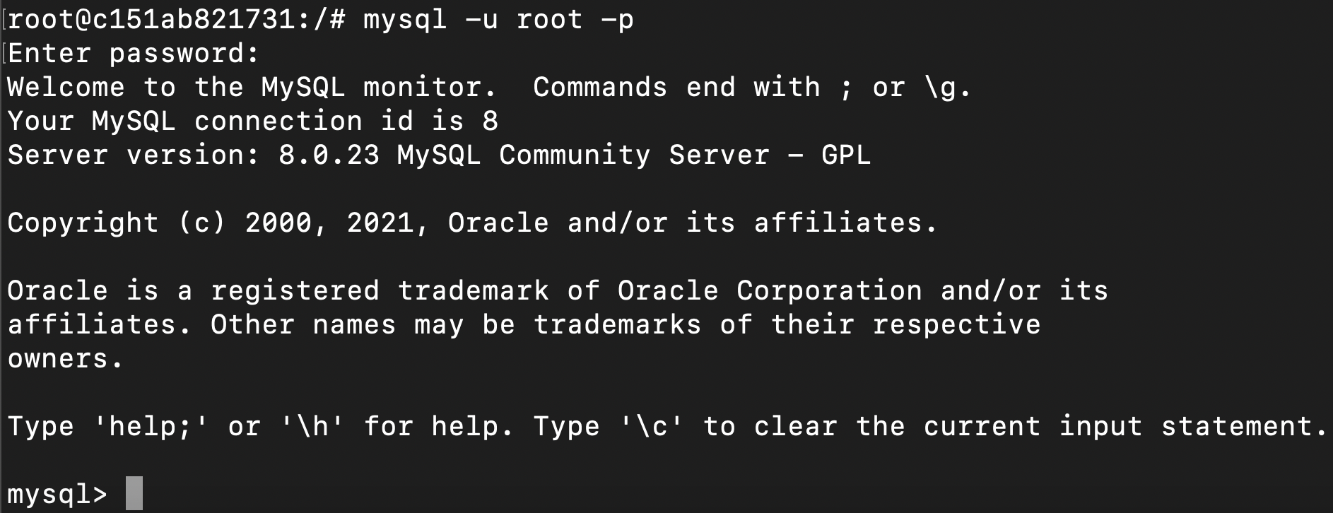 root@c151ab821731:/# mysql -u root -p