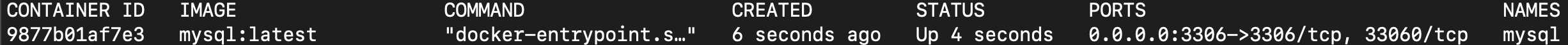 docker run -d -p 3306:3306 --name mysql -e MYSQL_ROOT_PASSWORD=my1234 mysql