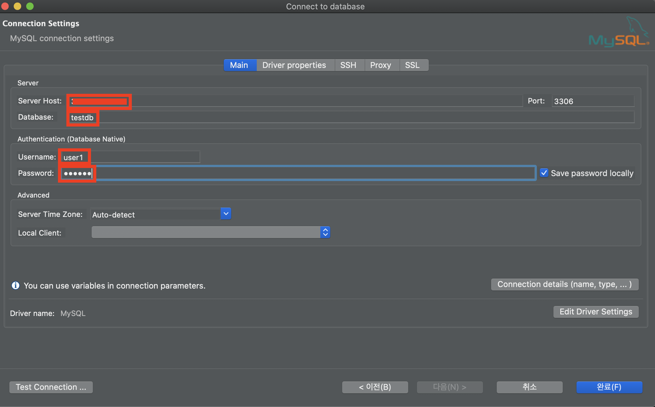아래 표시된 내용들을 입력하고 Test Connection ... 버튼을 클릭하도록하자.